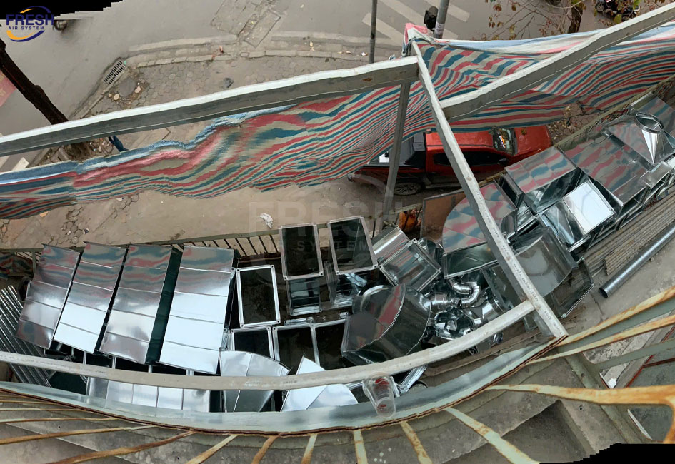 Hệ thống ống gió, co nối, giảm chấn, giá treo,… được thi công đồng bộ, đảm bảo độ kín, bền và thẩm mỹ.